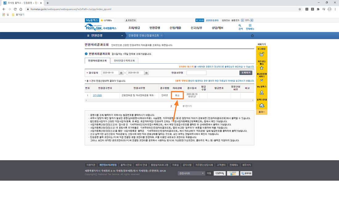 이전에 취소되었던 내역도 접수 완료로 되었네요 이 부분은 사이트에 버그가 있는 것 같습니다.