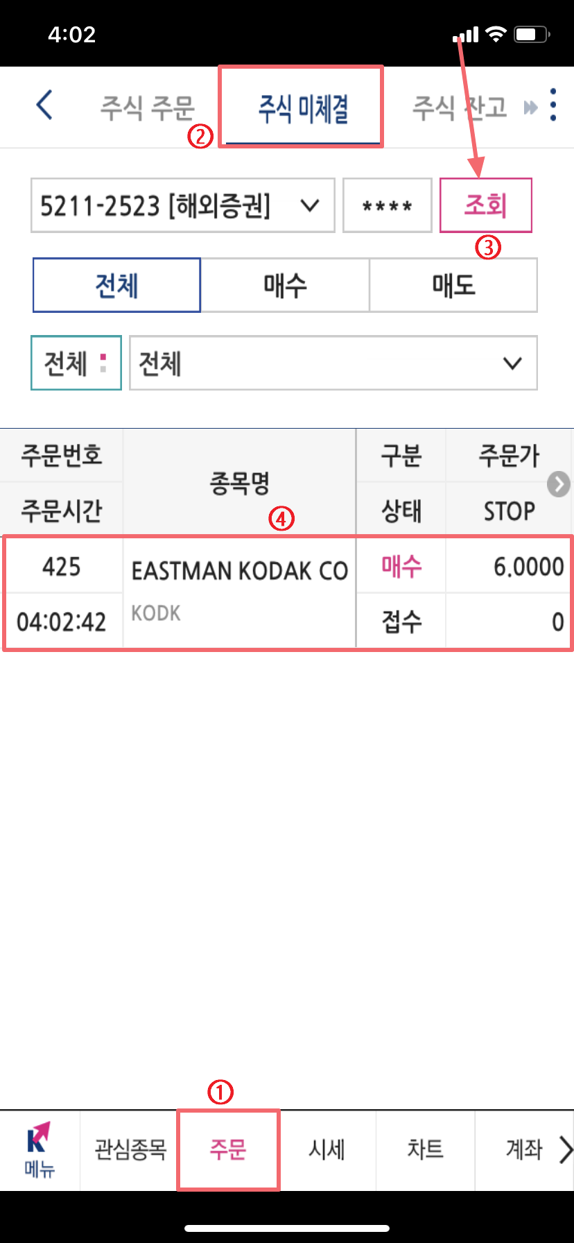 PC 프로그램에 비하면 모바일 환경에서 매수하고자 했던 주식을 취소하는 건 정말 간단합니다. 하단에 주문 메뉴 → 주식 미체결 → 조회 → 체결되지 않은 주식 선택하시면 됩니다.