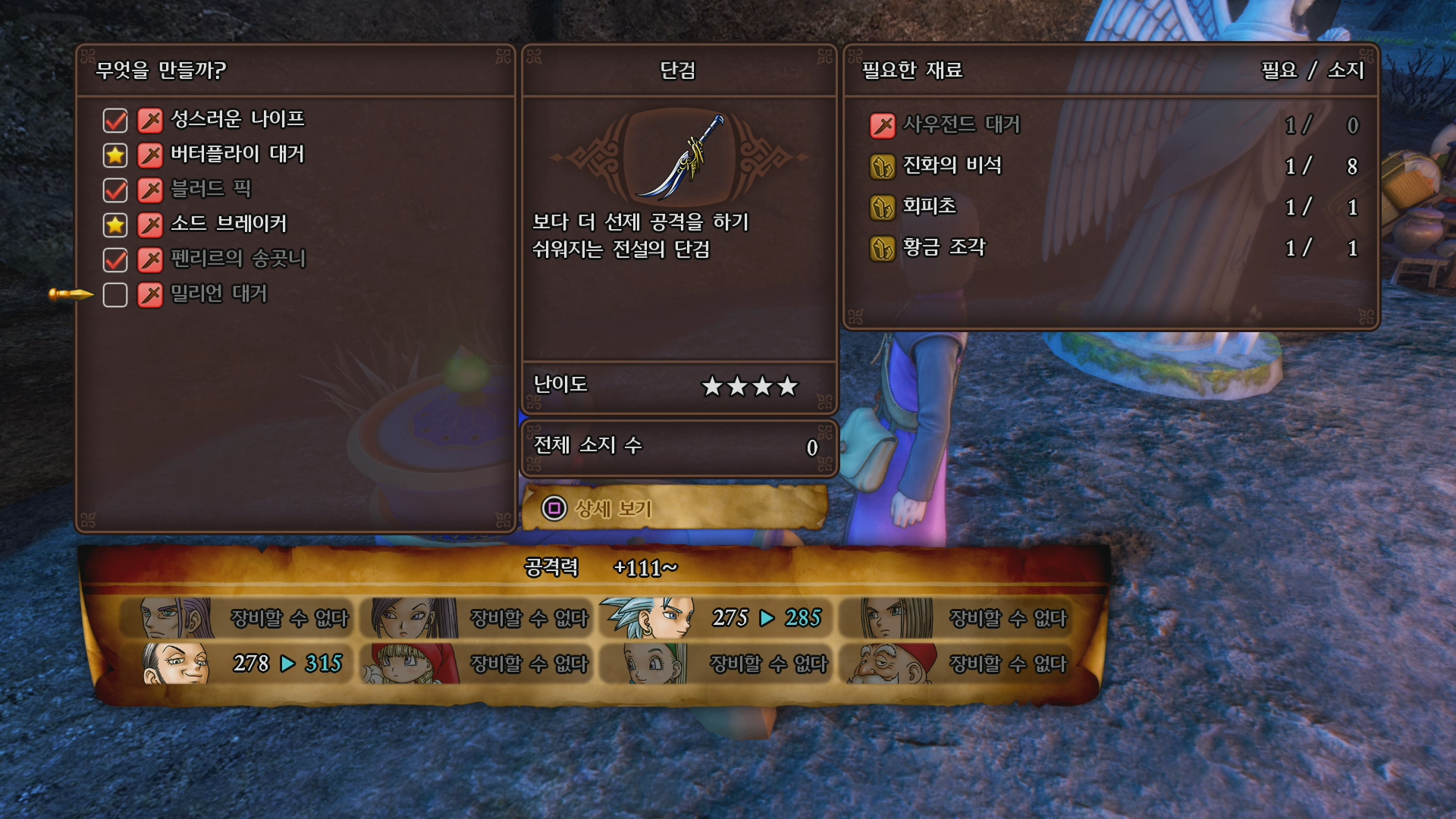 여러 가지 재료를 모으는 게 이 게임의 가장 시간 소모가 큰 부분 중 하나인데 드래곤퀘스트11 세계관에서 재료를 찾는 부분도 다른 게임에 비해 그다지 어렵지 않아 나쁘지 않았습니다.