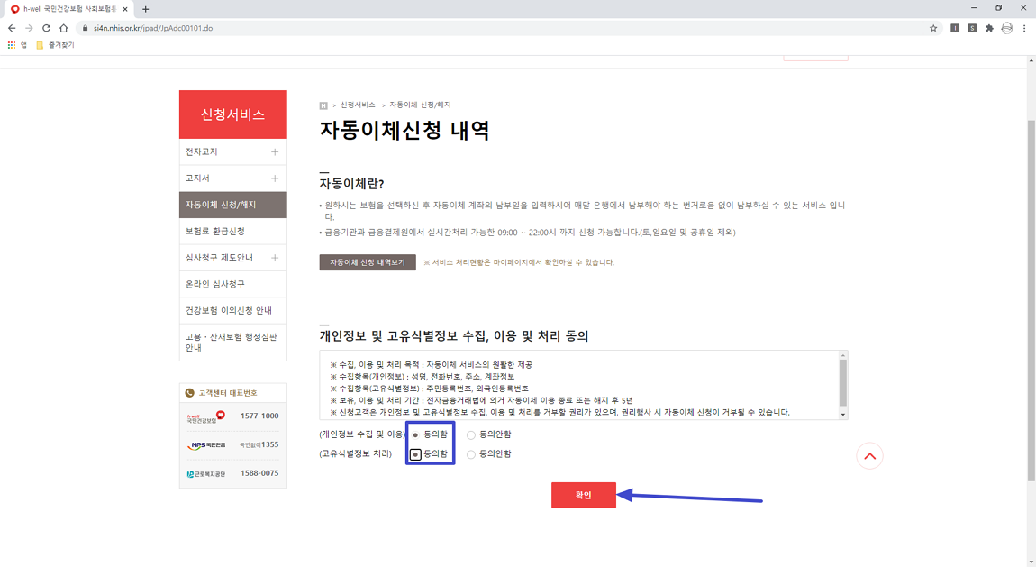 자동이체 신청 시 개인정보 이용 동의 모두 동의하시고 확인 버튼을 눌러 주시면 됩니다.