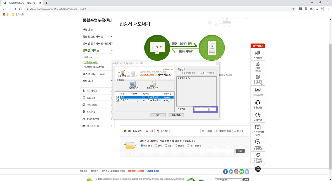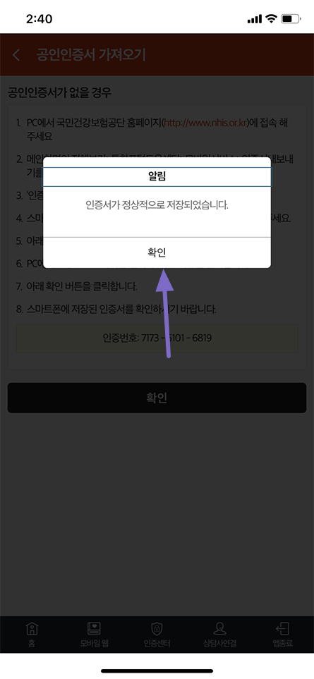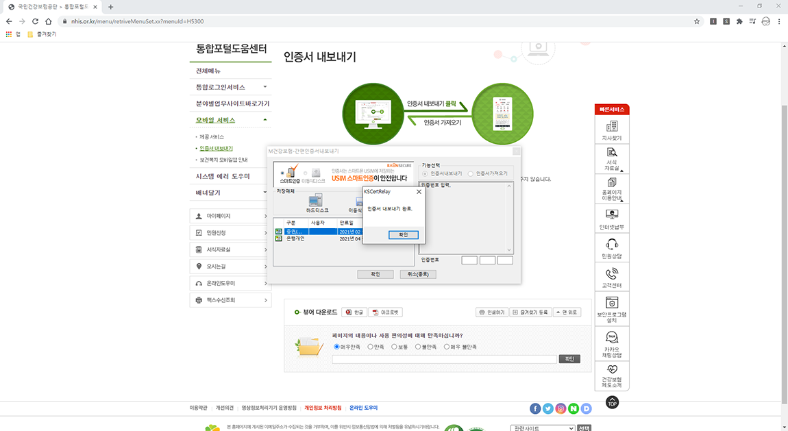 PC에서 작업이 모두 완료되면 인증서가 정상적으로 저장되었습니다. 라고 나오며 이제 스마트폰에서도 건강보험과 관련된 다양한 정보 확인이 가능합니다.