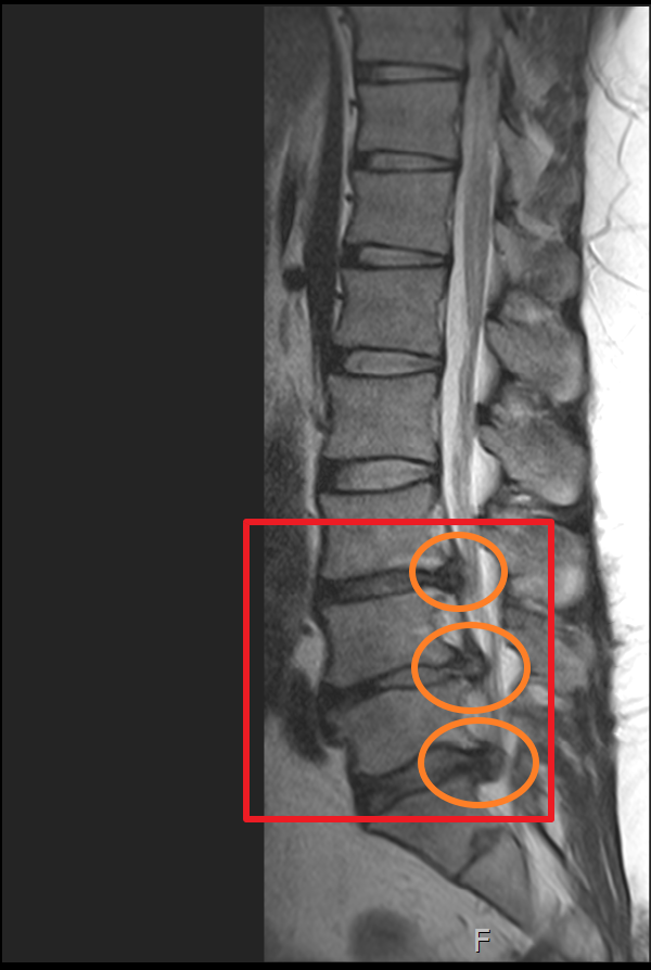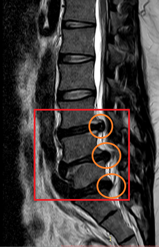 하지만 몸 관리를 꾸준히 잘하지 못하였고 4년 뒤 다시 허리디스크 상태가 악화하여 두 번째 MRI를 찍어보니 이전에 발병한 위치와 다른 곳에서 신경을 누르고 시작하였고 이전에 최초 발병한 허리디스크(첫 번째 동그라미)는 좀 나아졌으나 다른 곳에서(두 번째, 세 번째 동그라미) 또 문제가 생겼더군요.
