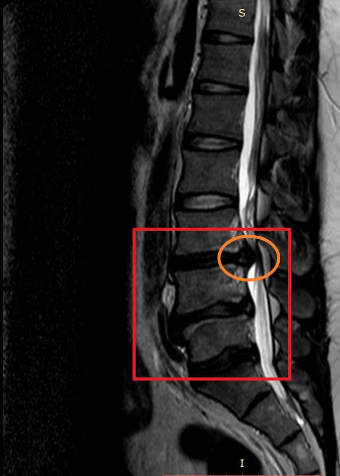 하지만 MRI 상 표시된 부분을 보면 첫 번째 허리디스크가 튀어나왔던 부분이 흡수된 게 확실히 보이며 이제는 다른 부분에 허리디스크가 눌려 신경을 누르고 있는 게 보입니다.