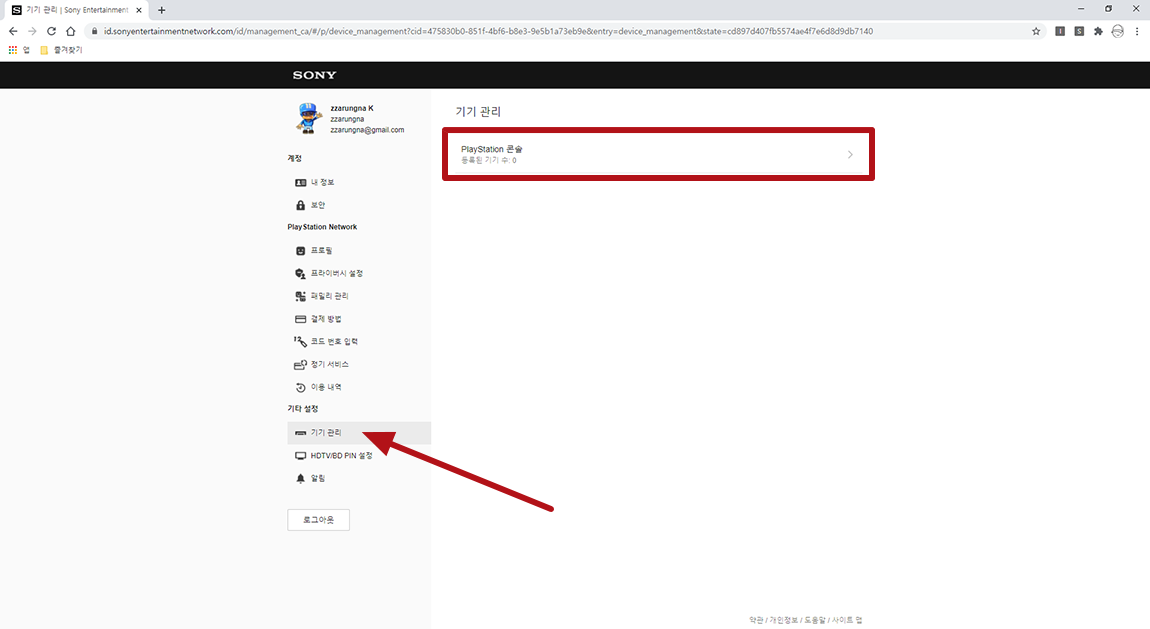 마찬가지로 저는 이미 기기 해제를 하였기에 등록된 기기 수가 0개이지만 이전에 등록했던 기기가 있으셨던 분은 기기 관리에 PlayStation 콘솔 메뉴를 선택해 기기 해제를 진행하실 수 있습니다.