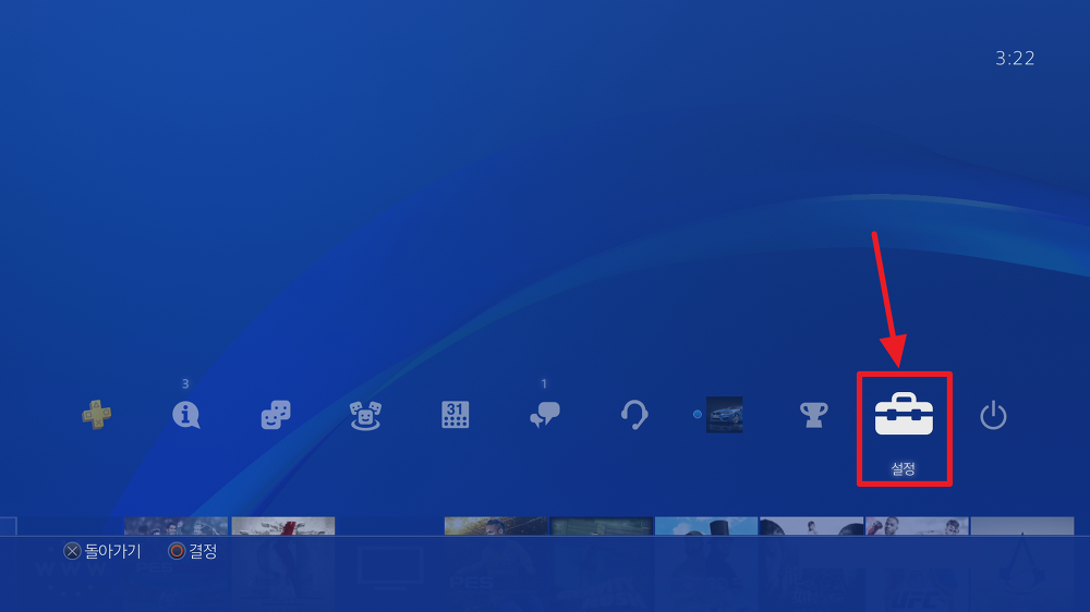 PS4 기기에서 기기를 해제하시려면 PS4 컨트롤러에 방향키 중 위로 방향키를 눌러 아래 이미지와 같이 설정 메뉴를 눌러 주시면 됩니다.
