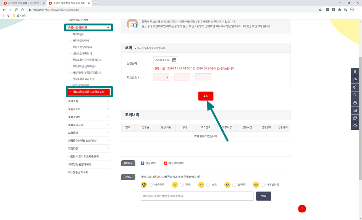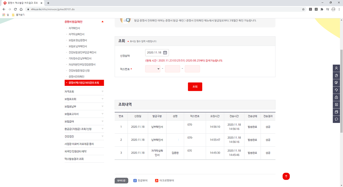 왼쪽 메뉴 중 증명서발급/확인 메뉴에 증명서 팩스발급처리 결과 조회 메뉴를 선택하시면 됩니다. 팩스를 전송했던 신청날짜를 선택하시고 이전에 전송했었던 팩스 번호를 반드시 입력 후 조회해야지만 조회 결과를 확인하실 수 있습니다.