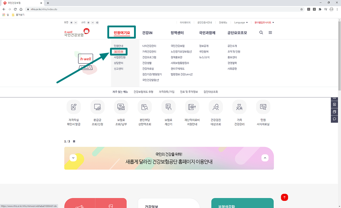 먼저 국민건강보험 사이트에 접속하시면 됩니다. www.nhis.or.kr 사이트 접속 후 로그인이 필요하며 로그인 시 공인인증서가 필요합니다.