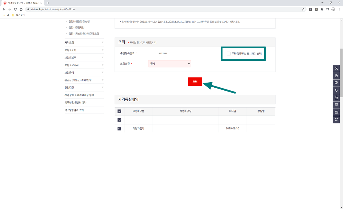 건강보험 자격 득실명세 메뉴를 선택 했을 때 화면이며 이곳에서 조회조건을 전체로 지정한 후 조회 버튼을 눌러 진행하였습니다.