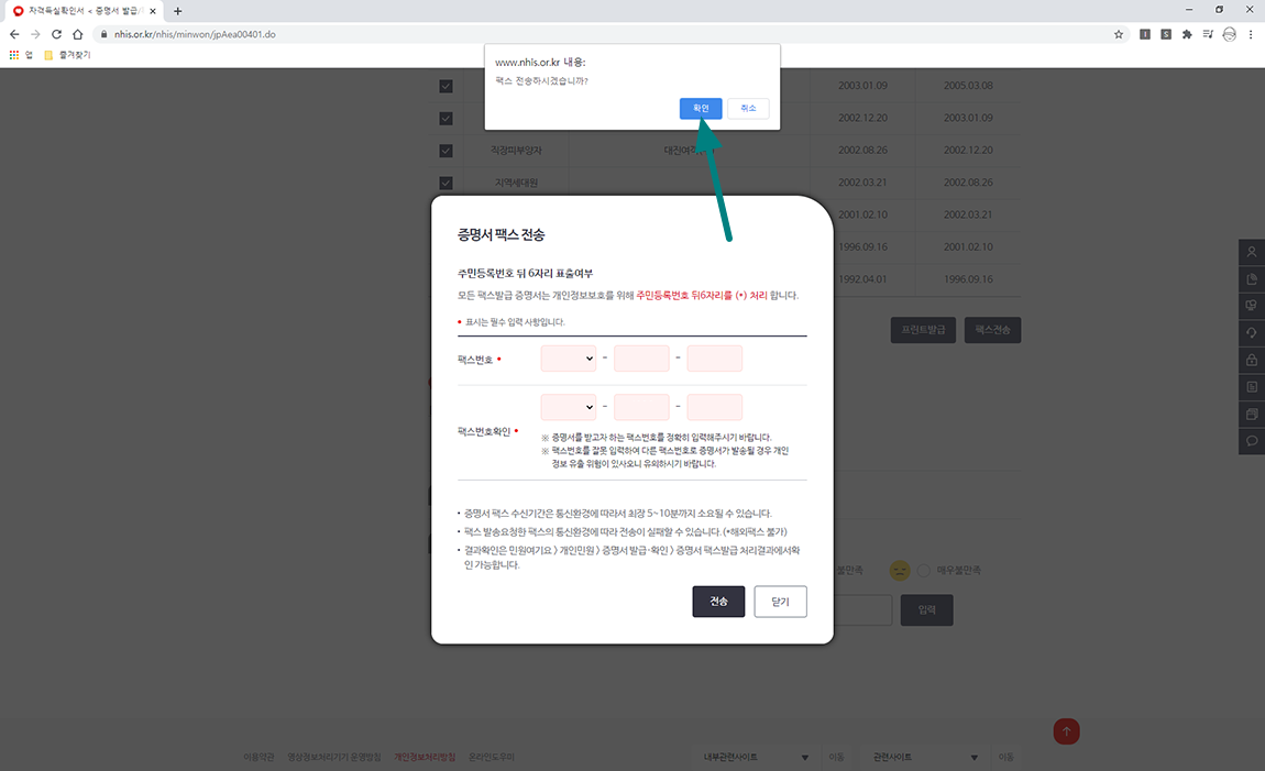 팩스 전송하시겠습니까? 문구에서 확인 버튼을 선택하시면 됩니다.