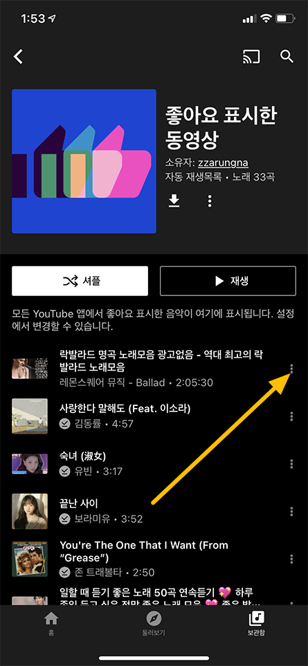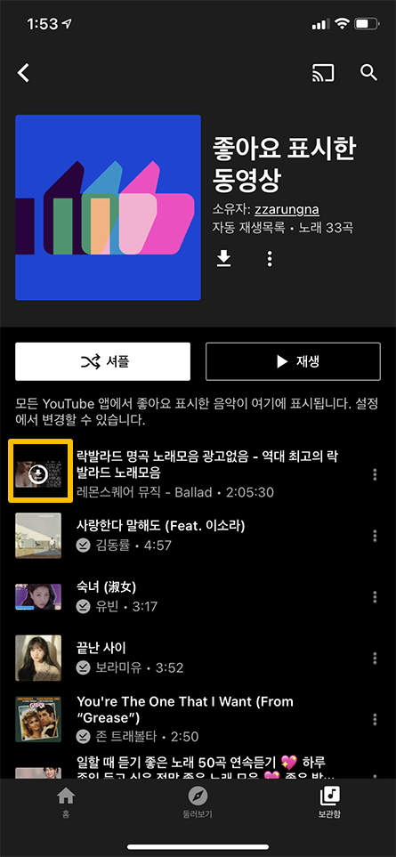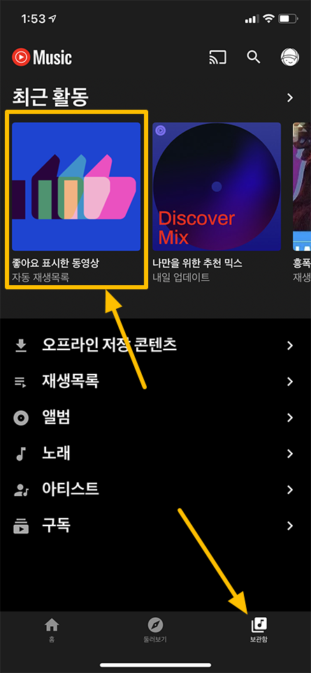 유튜브 뮤직앱을 실행한 뒤 유튜브 프리미엄을 사용하고 있는 계정으로 로그인하시면 됩니다. 로그인 이후에 하단 메뉴 중 보관함 메뉴를 누르신 후 좋아요 표시한 동영상 메뉴를 선택하시면 됩니다.