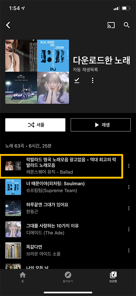 이곳에 있는 노래들은 모두 다운로드한 노래이기에 모바일 데이터를 사용하지 않아도 노래를 재생하여 들을 수 있으며 다양한 노래나 음악들을 추가로 리스트에 추가하여 일괄 재생도 가능합니다.