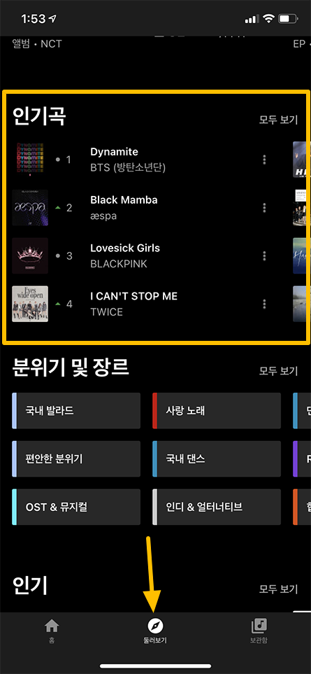 중간에 둘러보기 메뉴를 통해서 현재 인기곡도 바로 들을 수 있어 좋았고 장르별로 추천해 주는 노래도 다양해 좋았습니다.