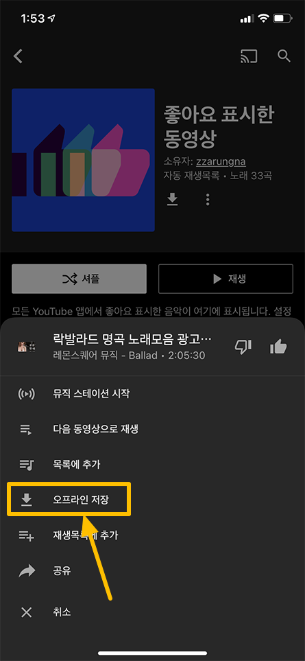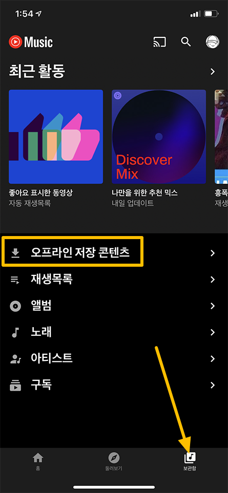 이곳에서 오프라인 저장 메뉴를 눌러 주시면 됩니다. 오프라인 저장 콘텐츠를 통해 데이터를 사용하지 않고 좋아하는 노래를 리스트에 추가할 수 있으며 들을 수 있습니다.