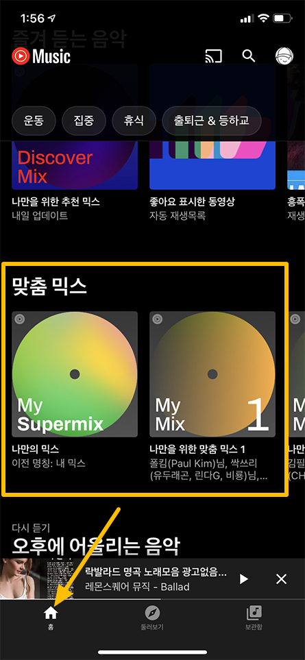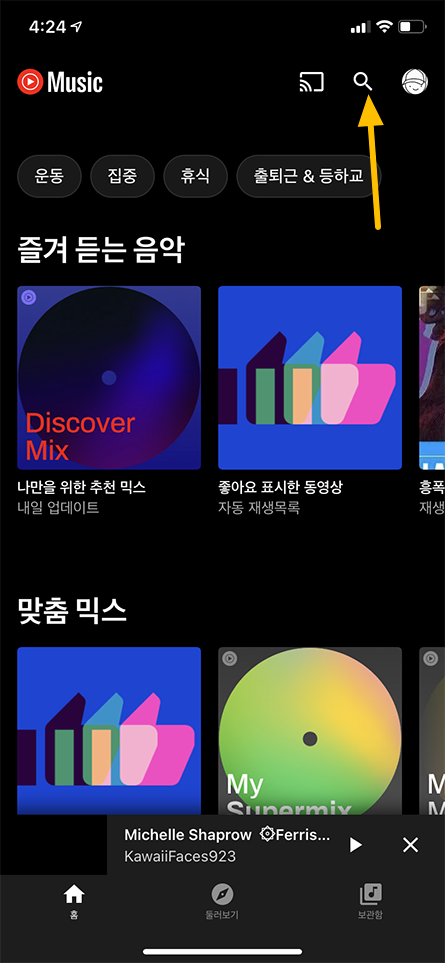 개인적으로 유튜브 뮤직앱을 선호하게 된 추가적인 이유 중 하나는 맞춤 믹스 기능입니다. 유튜브 프리미엄 계정이 로그인된 상태에서 시청했던 유튜브 동영상이나 들었었던 노래나 음악 등을 분석하여 자동으로 노래나 음악들을 추천해 주는 기능인데 노래를 자주 듣거나 즐기는 분들께선 공감 하실 텐대 평소에 들어보지 않았던 나와 취향이 맞는 노래를 찾으려면 시간도 꽤 오래 걸리고 찾기도 힘듭니다.