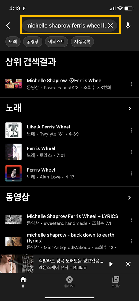 원하는 음악을 찾는 게 가능하며 노래뿐만이 아닌 동영상도 검색 결과에 포함됩니다. 다른 곳에서 찾지 못했던 음악들도 유튜브 뮤직 앱에서는 어렵지 않게 찾을 수 있습니다.