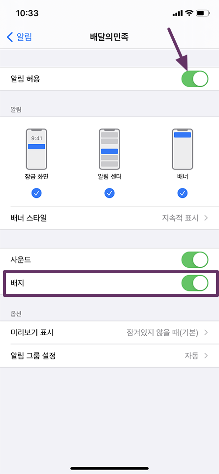 이곳에서 알림 허용 메뉴에 녹색 버튼이 활성화되어 있는걸 비활성화하면 모든 알림이 표시되지 않도록 설정 할 수 있지만 알림은 계속 받고 빨간색 숫자로 표시되는 알림만 비활성화 하고 싶으시다면 알림 허용은 녹색 버튼이 표시되도록 활성화하시고 배지 부분만 녹색 버튼이 나오지 않도록 비활성화해주시면 됩니다.