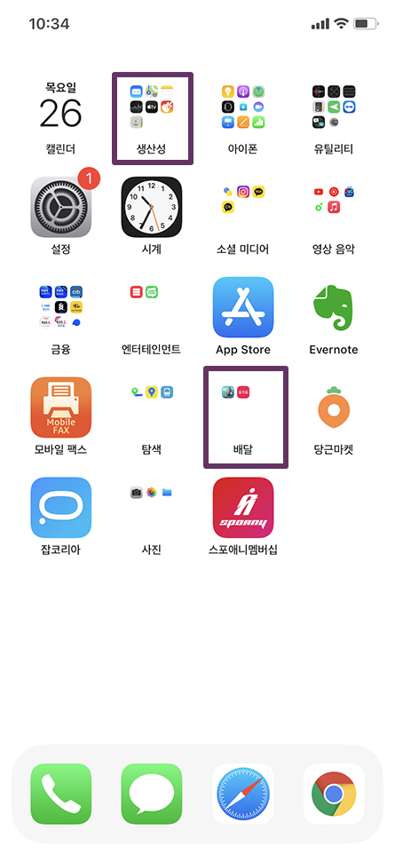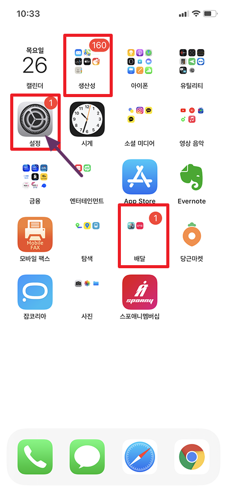 아래 이미지와 같이 생산성 폴더에 메일 앱 때문에 배지 알림이 쌓이고 있었고 설정은 아이폰 업그레이드 알림이며 배달 앱에서는 배달의 민족 앱에서 알람이 표시되고 있었네요.