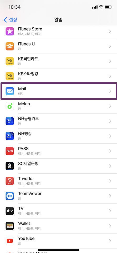 기본적으로 아이폰에 설치되어있던 Mail 앱도 알림 목록에 찾아보시면 있습니다. 메일 앱의 경우는 알림은 꺼져 있는데 배지 알림만 활성화되어 있네요.