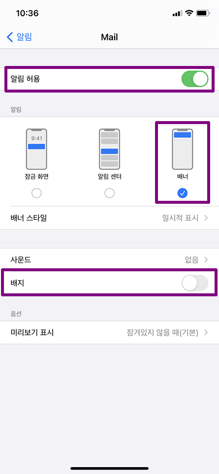 아래 이미지와 같이 알림 허용을 모두 비활성화했는데 생각해 보니 중요한 메일은 바로 확인할 수 있도록 배지 알림만 표시되지 않도록 하고 새로운 메일은 알림을 통해 확인할 수 있도록 해놔야겠습니다.