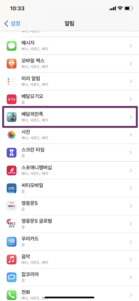 알림 메뉴에서 스마트폰에 설치된 모든 앱이 표시되는 데 이곳에서 빨간색 숫자 알람이 표시되고 있는 앱을 하나씩 들어가시면 됩니다. 먼저 배달의 민족 앱을 선택해 보겠습니다.