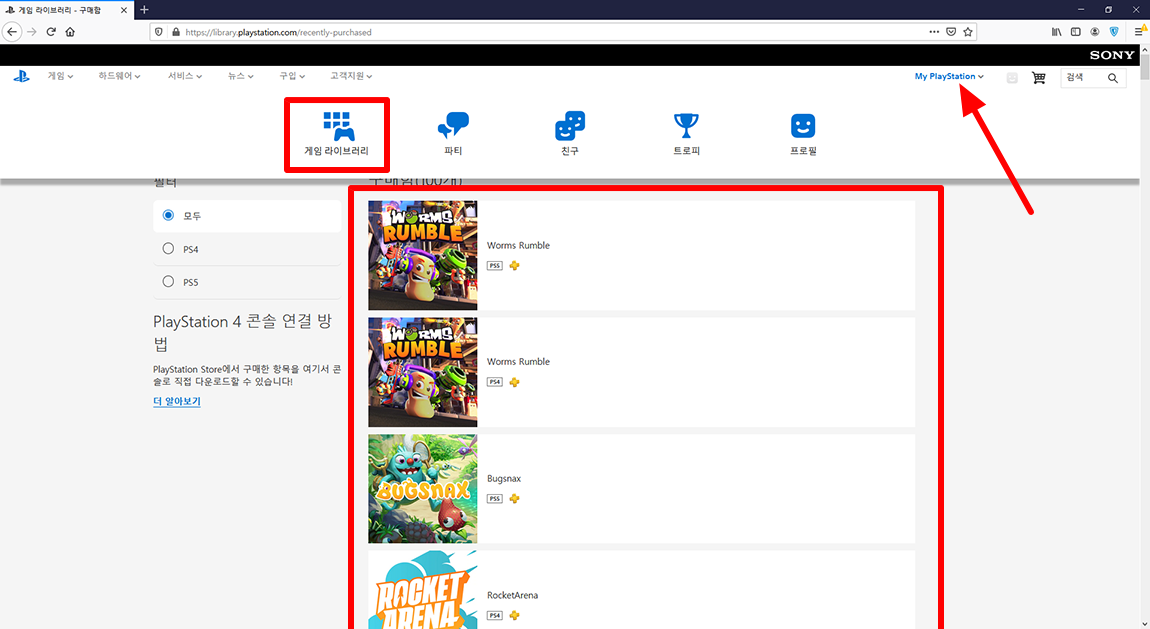 정상적으로 PS Plus의 이달의 무료 게임이 구매되었는지 확인하시려면 아래 이미지 화살표 방향에 표시된 My PlayStation 메뉴를 선택하시고 게임 라이브러리 메뉴를 선택하시면 구매한 게임 리스트를 호가인 하실 수 있습니다.