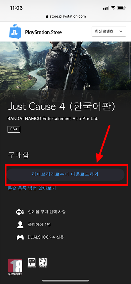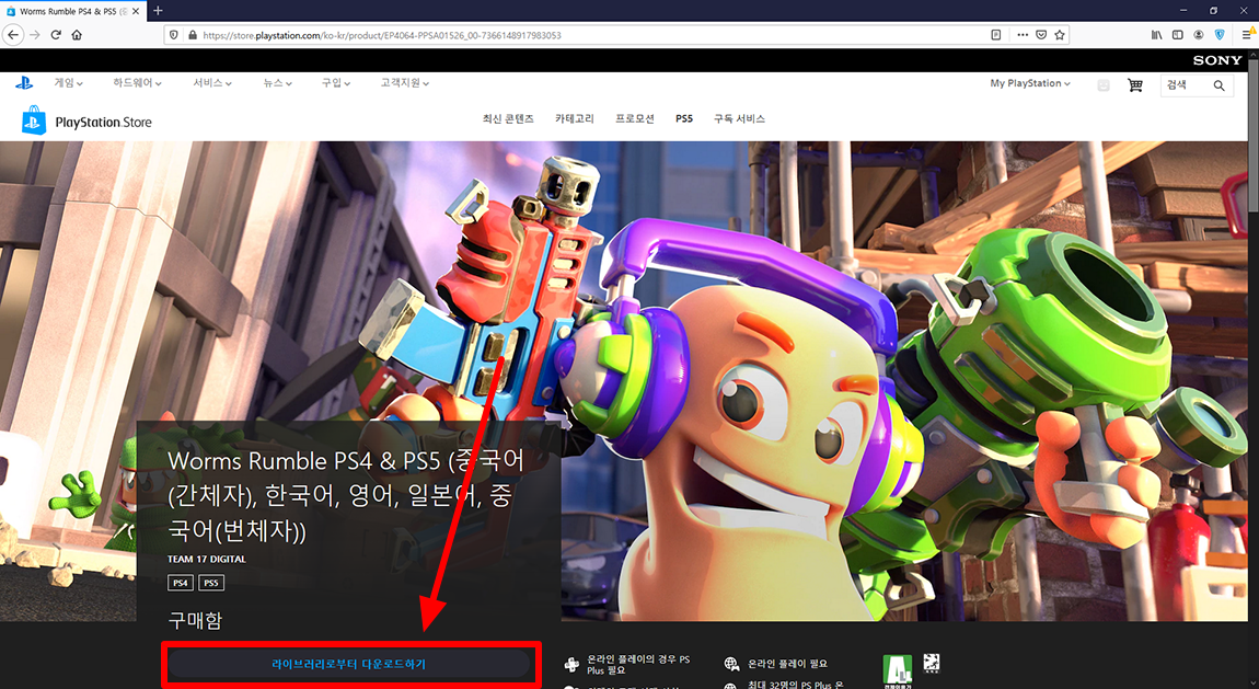 이달의 무료게임 추가를 완료하신 후 아래 PS 기기 연결이 되어 있다면 라이브러리로부터 다운로드하기 버튼을 누르시면 PS 기기에서 자동으로 게임 다운로드가 진행됩니다.