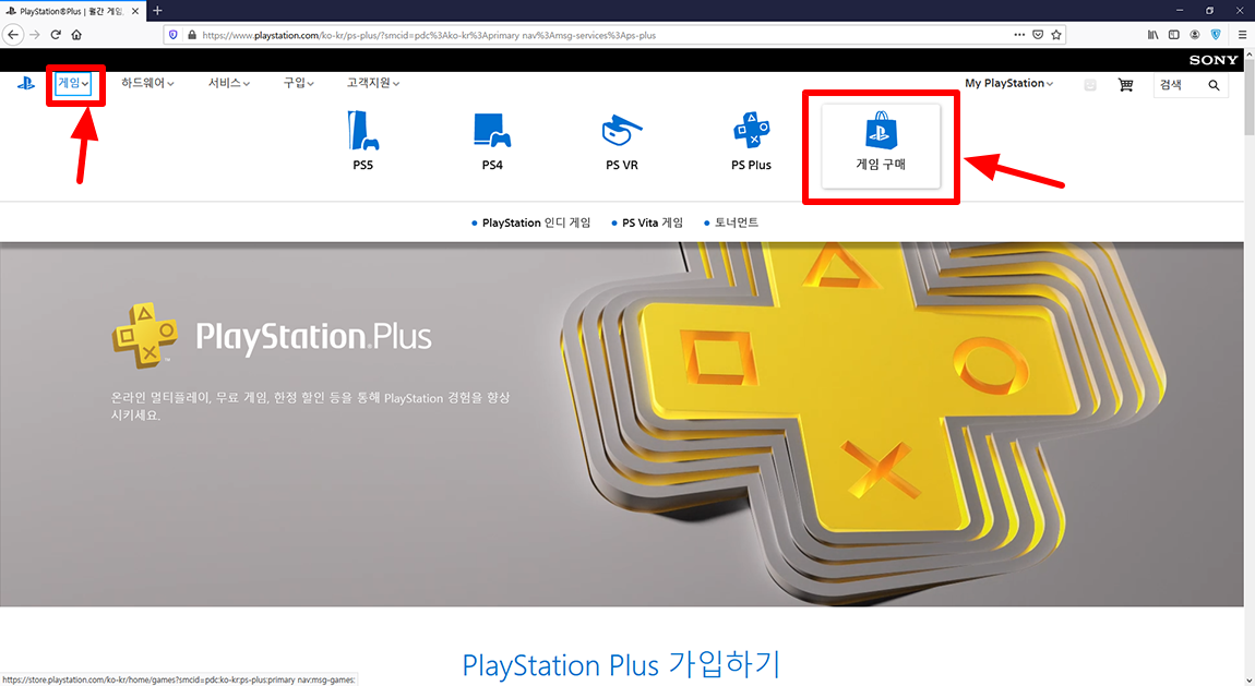 먼저 www.playstation.com/ko-kr 사이트에 접속하신 후 PS Plus에 가입된 소니 계정으로 로그인하시면 됩니다. 로그인하신 후 상단에 게임 메뉴를 선택 후 게임 구매 메뉴를 선택하시면 됩니다.