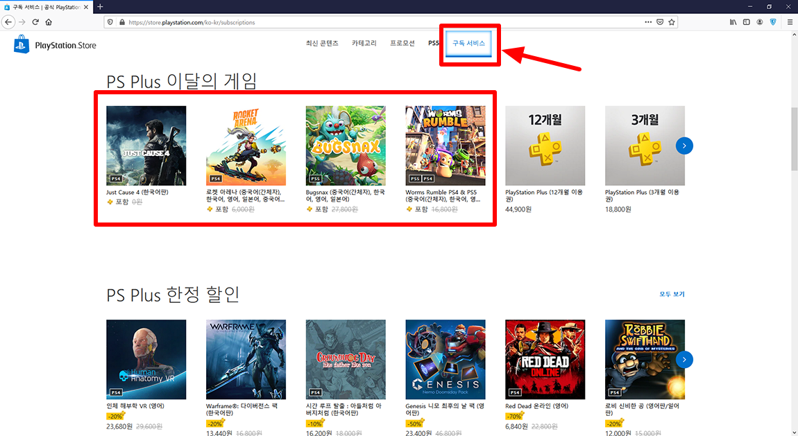 이곳에서 상단에 구독 서비스 메뉴를 누르신 후 페이지를 조금 내려 보시면 PS Plus 이달의 무료 게임 목록을 확인하실 수 있습니다. Just Cause4, 로켓 아레나, Bugsnax, 웜즈 게임이 있으니 하나씩 모두 선택하시면 됩니다.