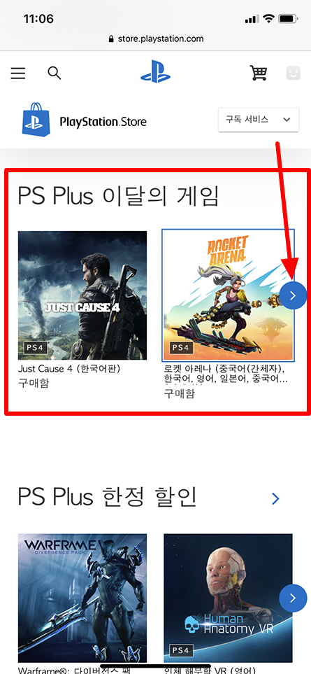페이지 중간 PS Plus의 이달의 무료 게임 목록을 확인할 수 있으며 추가로 무료 게임이 더 있는지 확인하시려면 파란색 화살표 방향에 표시된 버튼을 눌러 무료로 주는 게임이 더 있는지 체크해 보시면 좋을 듯합니다.