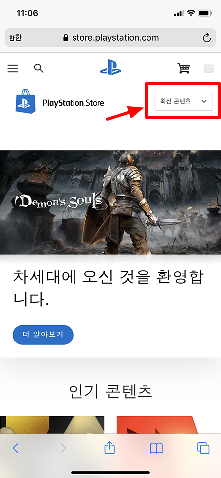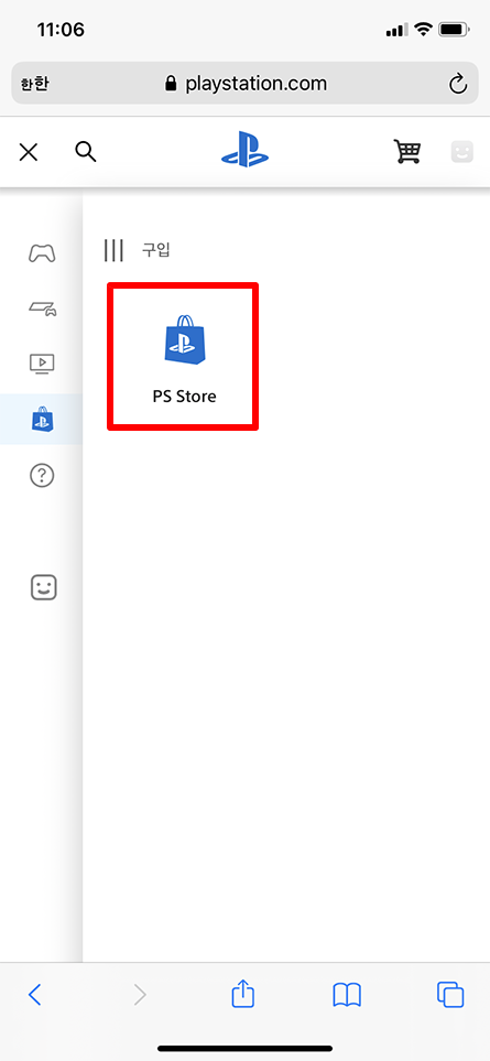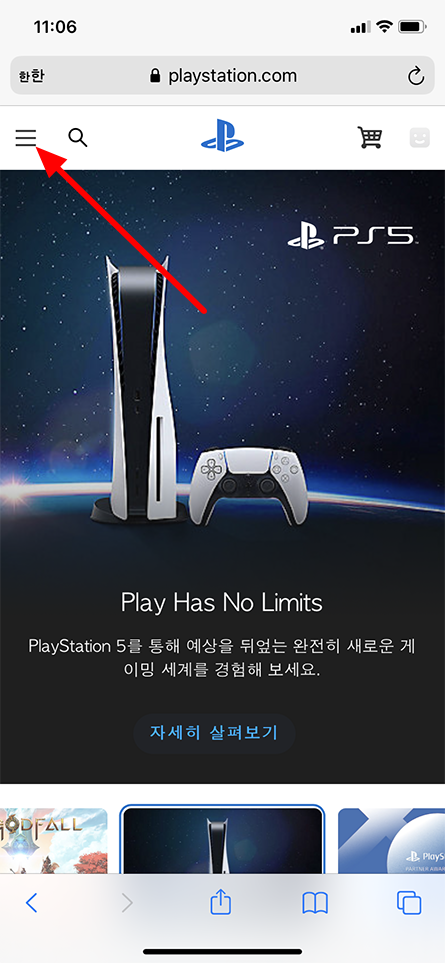 모바일 브라우저를 실행하시고 www.playstation.com/ko-kr사이트에 접속 하신 후 왼쪽 상단에 메뉴 버튼을 누르시면 됩니다.