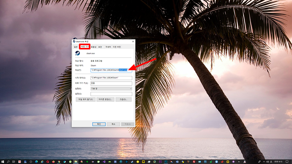 이곳에서 상단에 바로 가기 메뉴에 내용 중 대상 부분에 .exe가 한글인지 영어인지 이름은 무엇으로 되어 있는지 확인하실 수 있습니다.