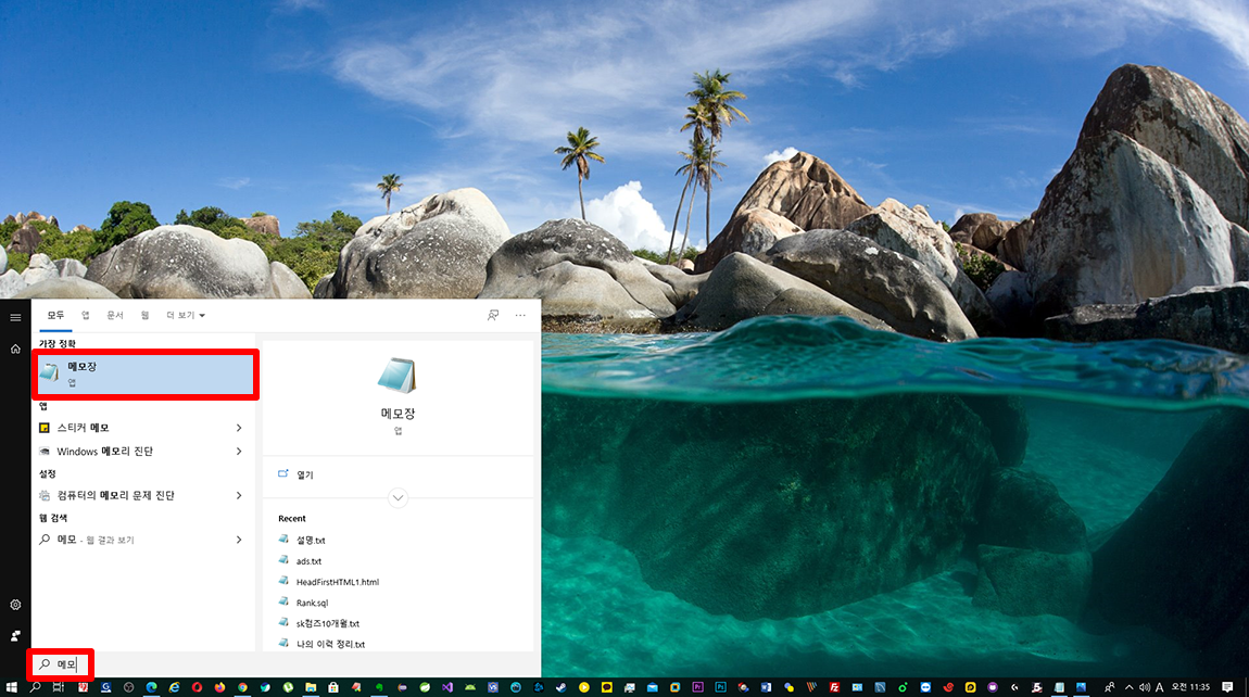 윈도우10 시작 버튼을 누르시거나 윈도우키를 누르신 후 단어를 입력하면 아래 이미지와 같이 메모만 눌러도 메모장 프로그램이나 그림판 프로그램도 간단히 검색해서 실행할 수 있어 편합니다. 단어를 입력하는 부분이 없지만 윈도우키를 누르시고 글자를 입력하면 단어가 입력 되며 관련 프로그램 검색이 됩니다.