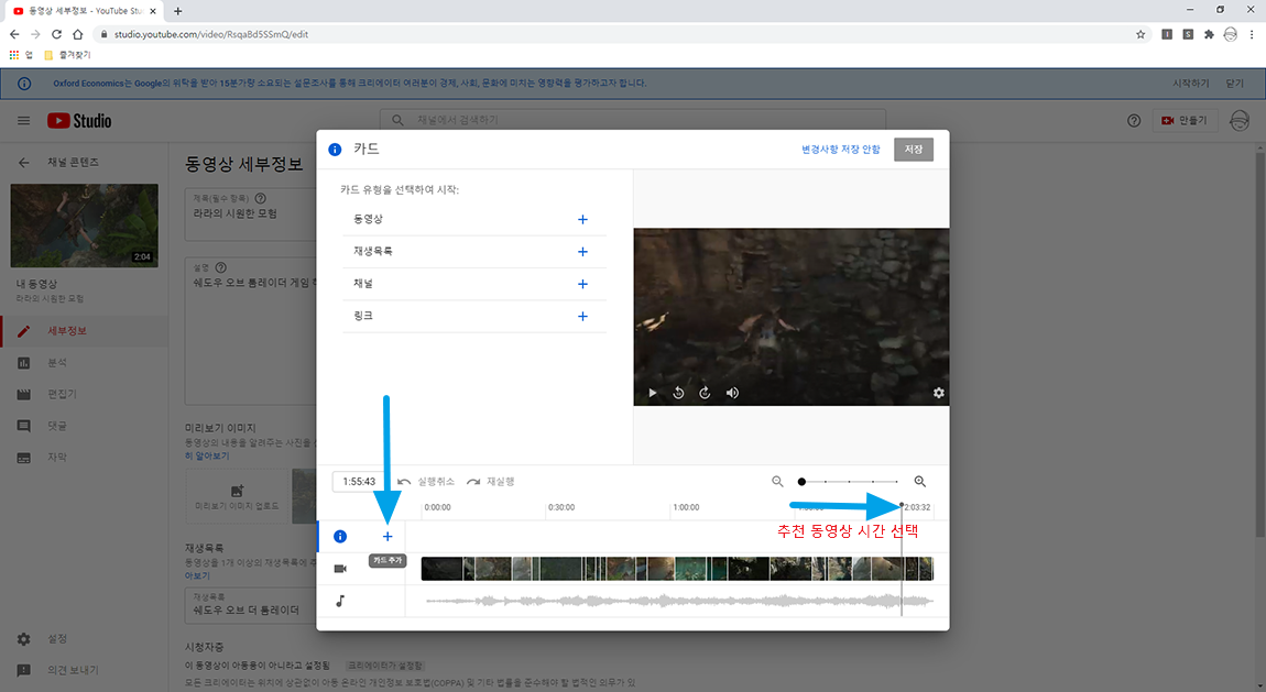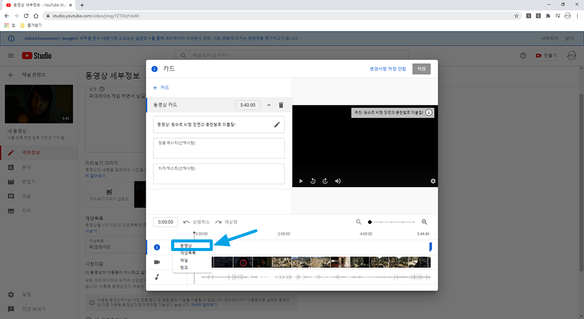먼저 추천 동영상 카드가 나오는 시간을 선택하셔야 합니다. 오른쪽 하단에 동영상 시간을 지정할 수 있는 바를 마우스로 끌어 원하는 시간대를 먼저 지정하시면 됩니다.