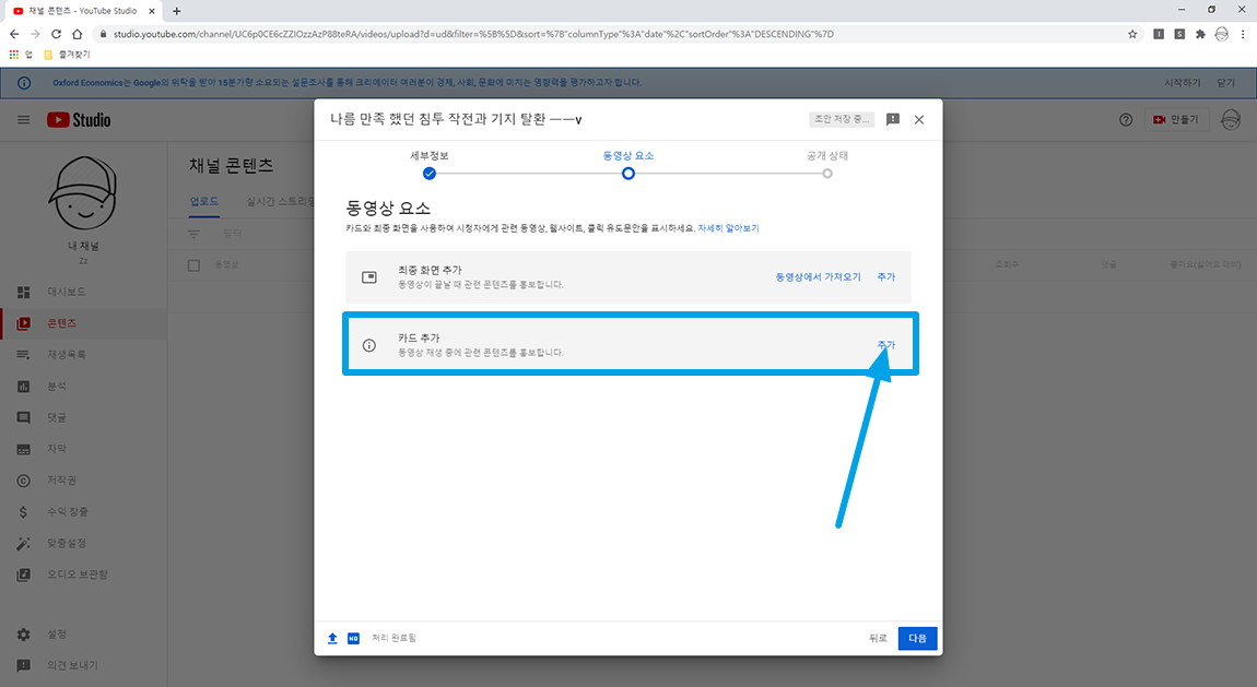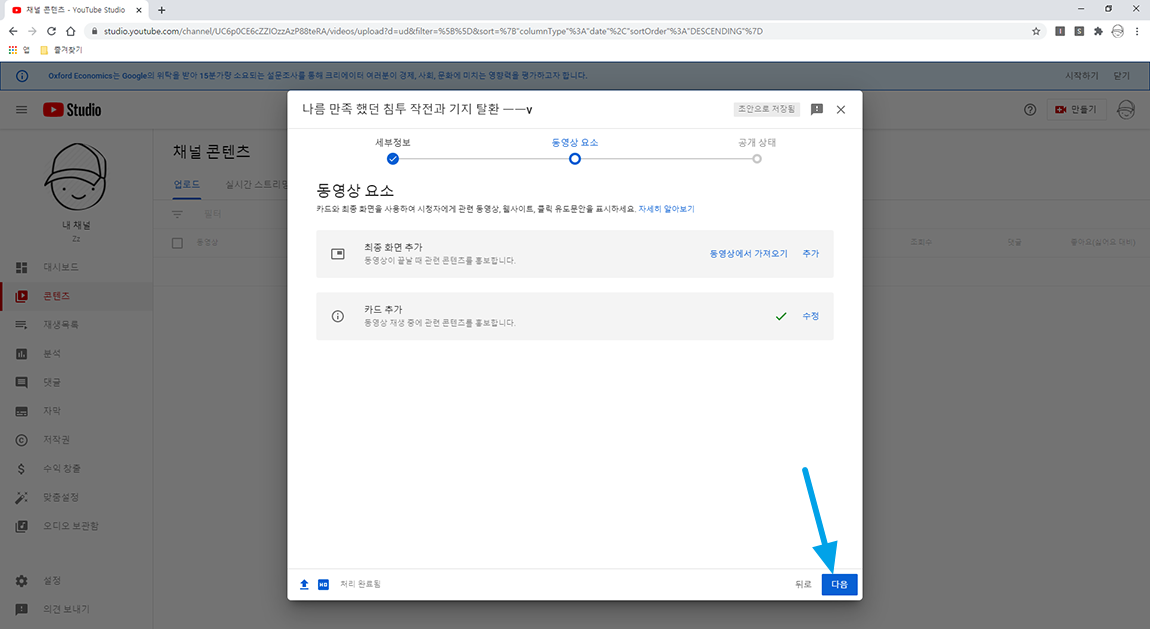 유튜브 채널에 동영상을 업로드 후 바로 추천 카드를 바로 적용하시려면 아래 이미지와 같이 업로드 동영상 진행 중 다음 버튼 선택.