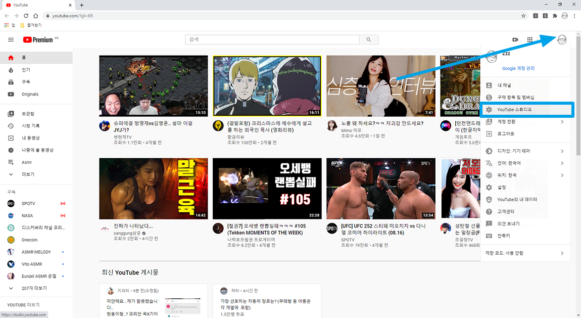 먼저 구글 계정이 로그인 된 상태에서 유튜브 사이트에 접속하시면 됩니다. www.youtube.com/?gl=KR 구글 계정에 로그인된 상태에서 유튜브 사이트에 접속하시면 오른쪽 상단 화면에 자신의 아이콘이 나옵니다. 아이콘을 선택하시고 YouTube 스튜디오 메뉴를 선택하시면 됩니다.