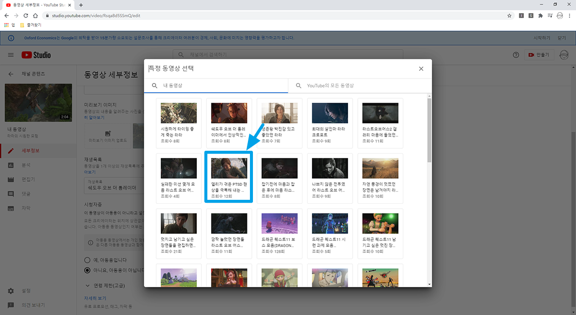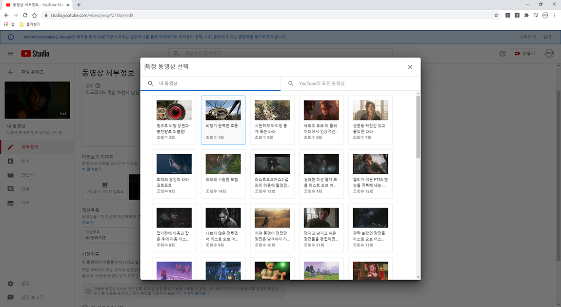 이곳에서 자신의 유튜브 채널에서 업로드 했던 영상 중 추천하고자 하시는 동영상 하나를 선택하시면 됩니다.