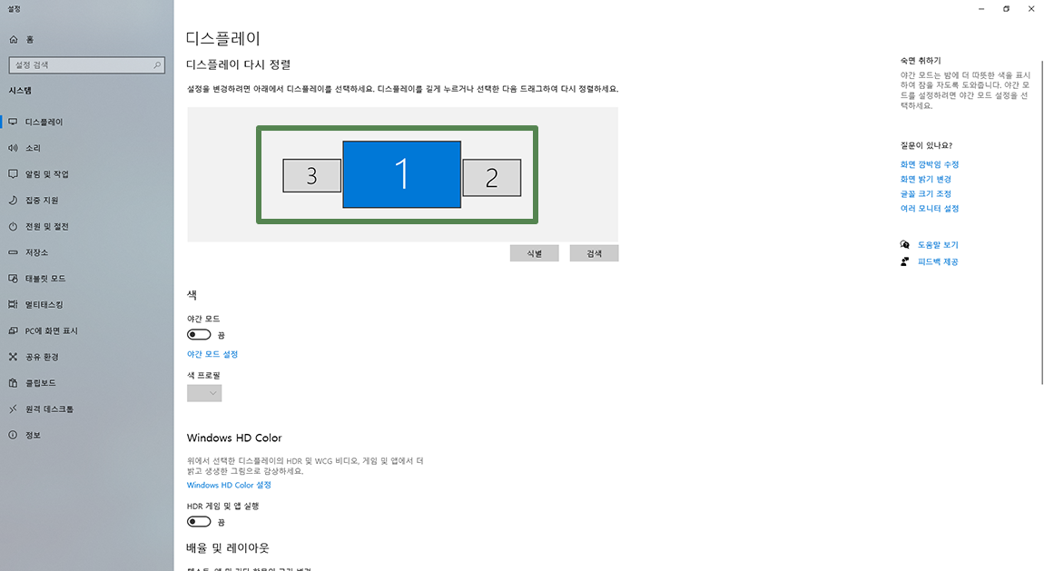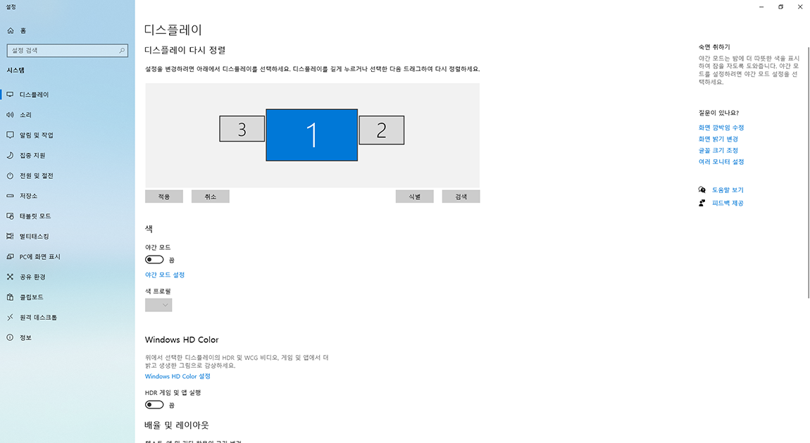 이곳에서 다중 디스플레이의 영역을 원하는 형태로 정렬이 가능합니다. 3번 1번 2번 모니터 영역을 마우스로 선택 후 드래그하시면 원하는 대로 정렬이 가능합니다.