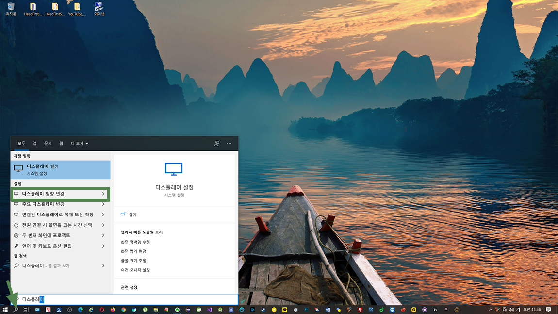 PC 윈도우 환경에서 다중 디스플레이 영역을 원하는 대로 조정하거나 세밀하게 조정도 가능합니다. 아래 이미지와 같이 윈도우 10 환경에서 키보드의 윈도우 버튼이나 돋보기 모양의 아이콘을 누르신 뒤 디스플레이라는 이름으로 검색하면 디스플레이 방향 변경 메뉴가 나옵니다. 검색된 내용 중 디스플레이 방향 변경 메뉴를 선택하시면 됩니다.
