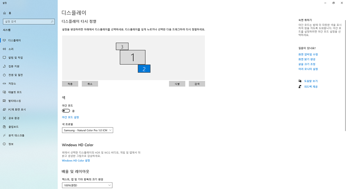 이러한 내용을 인지하고 있지 않은 상황에서 다중 모니터를 사용할 땐 다중 모니터의 각각의 영역 이동이 안 되어서 불편해 세부 조정도 해보고 그랬던 것인데 각각의 모니터 간 이동이 안 되는 이유에 대해 정확히 파악한 상황에선 기본 세팅된 상태로 사용한 게 제일 편했던 것 같습니다.