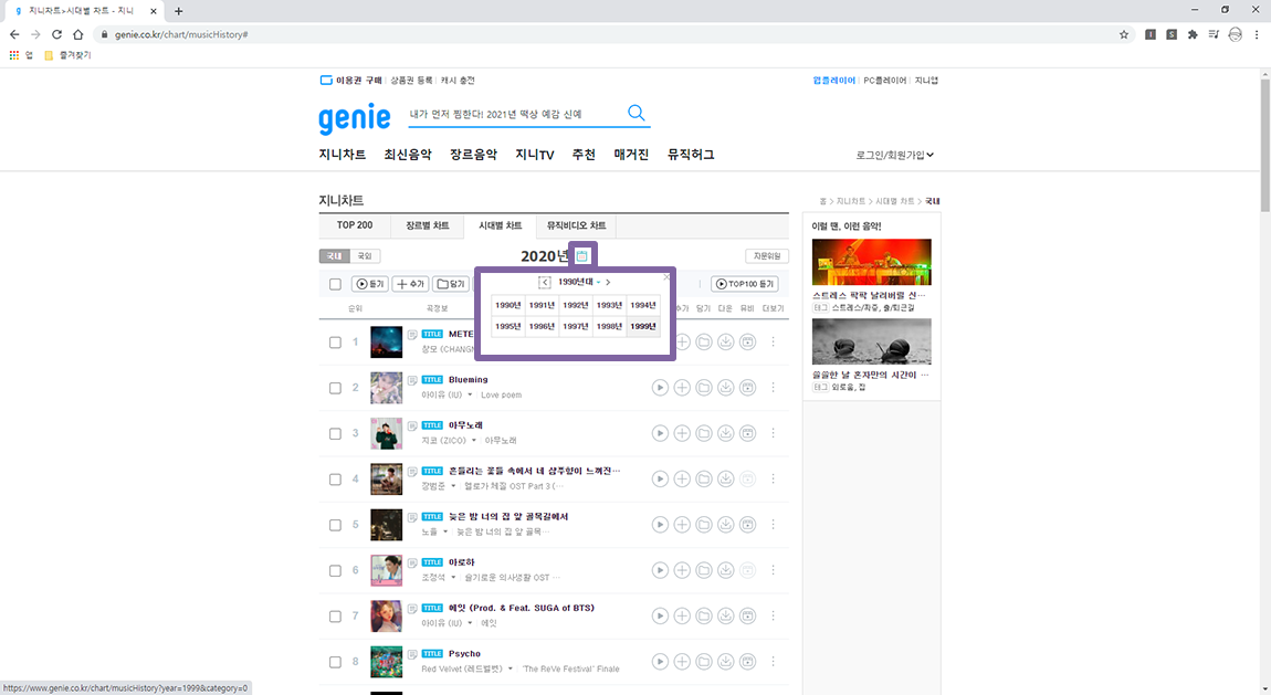 지니차트 메뉴에서 시대별 차트 메뉴 선택.