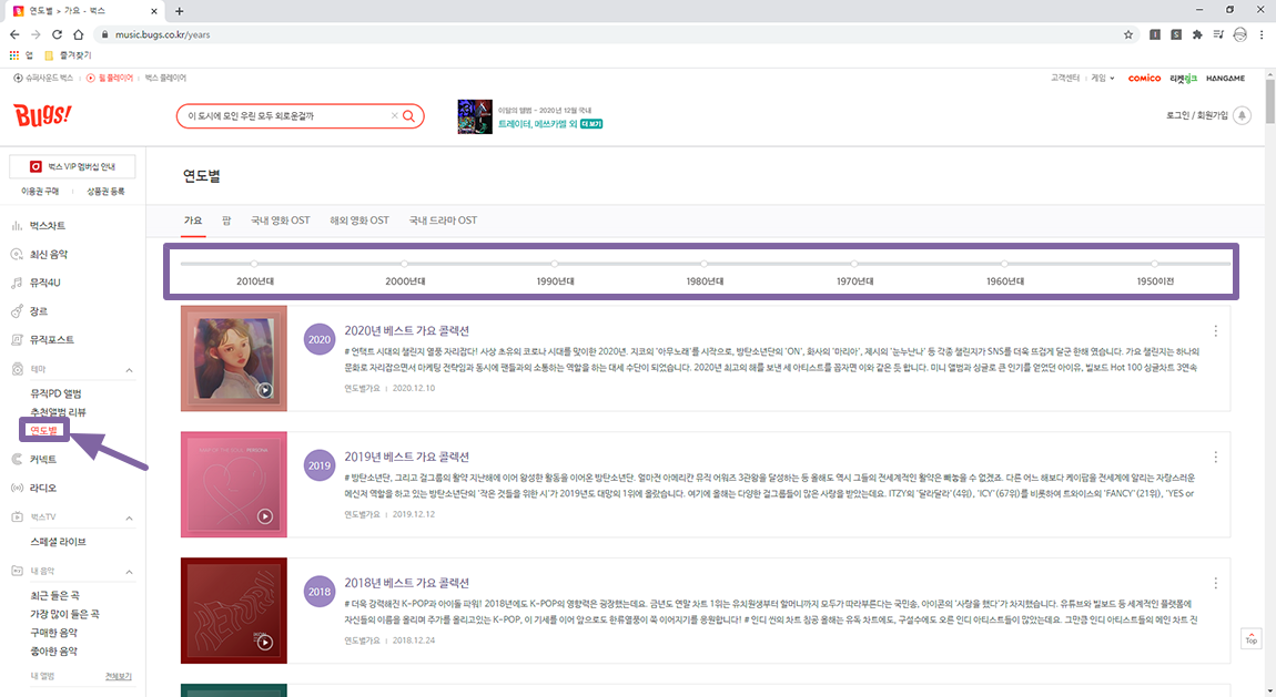 그럼 아래 이미지와 같이 원하는 시대별 년도 선택을 통해 노래 리스트를 확인하실 수 있습니다.