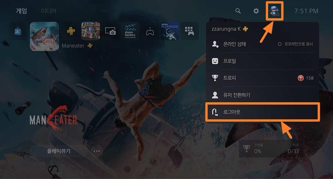 PS5 화면의 상단 메뉴 중 프로필 메뉴를 선택 후 로그아웃 메뉴를 선택하시면 됩니다.