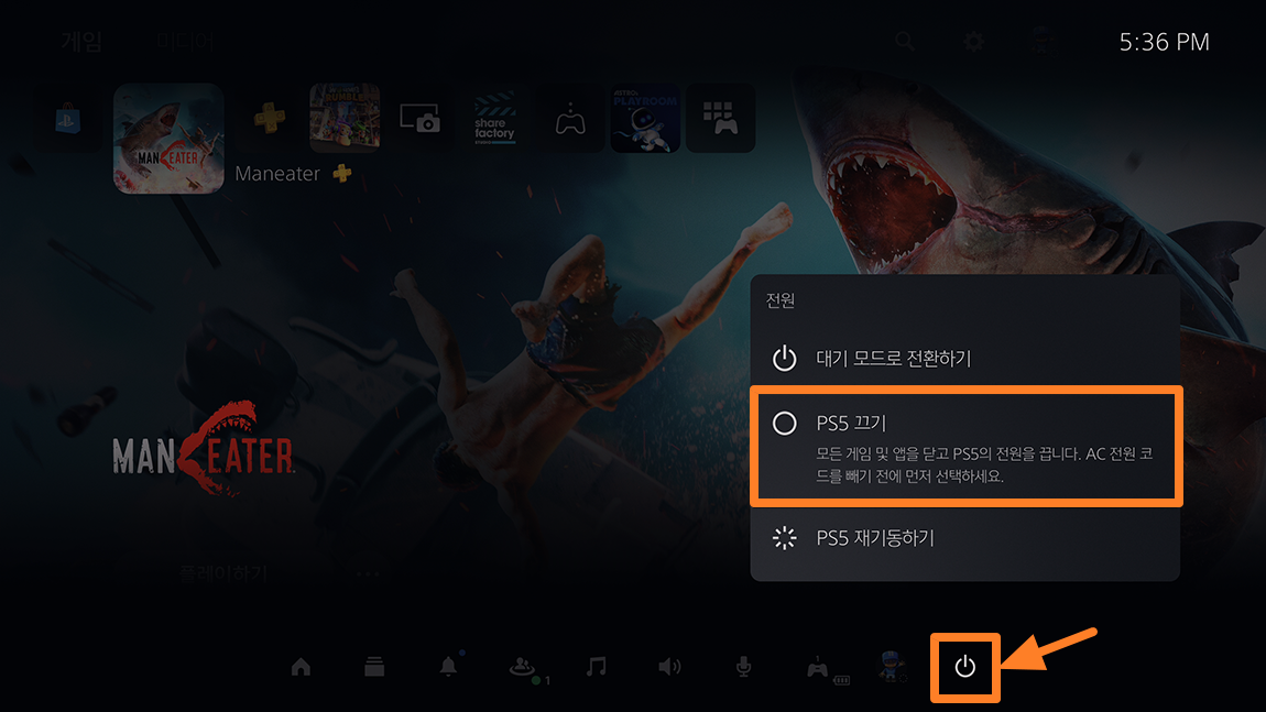 가장 간단한 방법은 PS5 컨트롤러에서 PS 버튼을 누르신 후 하단에 전원 모양의 버튼을 선택 후 PS5 끄기 메뉴를 선택하시면 됩니다.