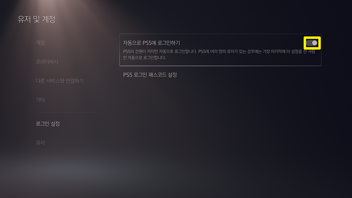 왼쪽 메뉴 로그인 설정 메뉴 선택 후 자동으로 PS5에 로그인하기를 활성화해주시면 됩니다.