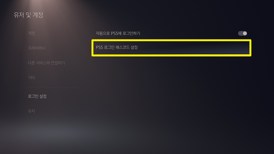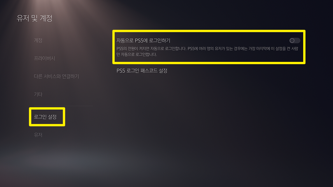 왼쪽 메뉴 로그인 설정 메뉴 선택 후 자동으로 PS5에 로그인하기를 활성화해주시면 됩니다.