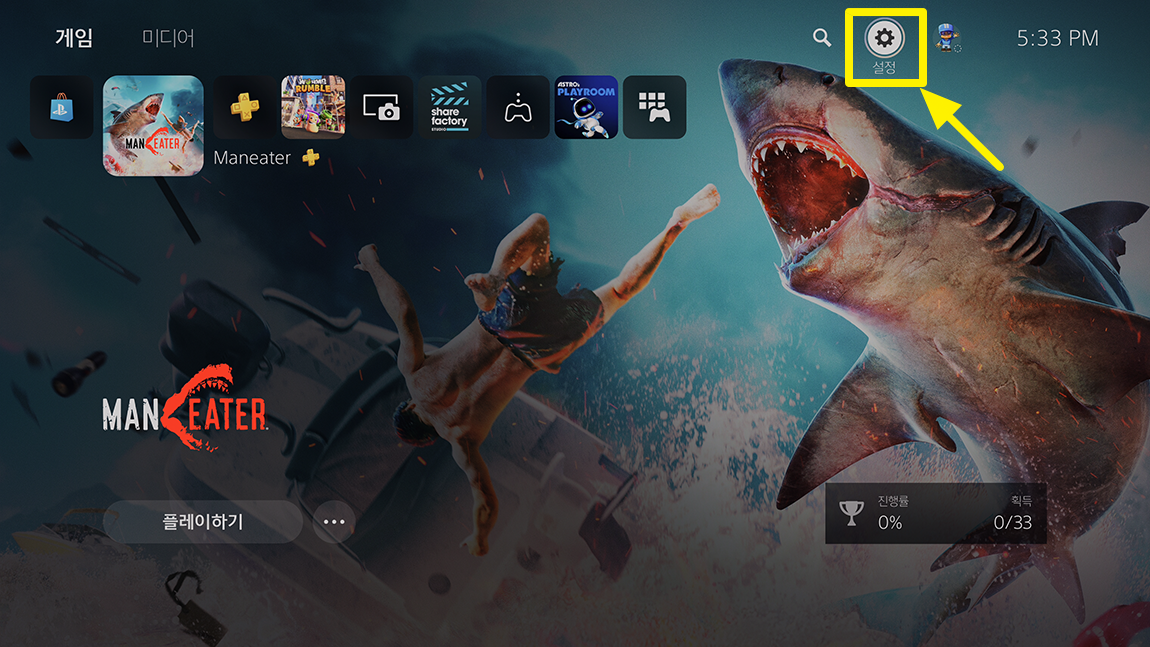PS5 자동 로그인을 설정하시려면 먼저 PS5 컨트롤러의 ↑ 버튼을 눌러 설정 메뉴로 진입하시면 됩니다.
