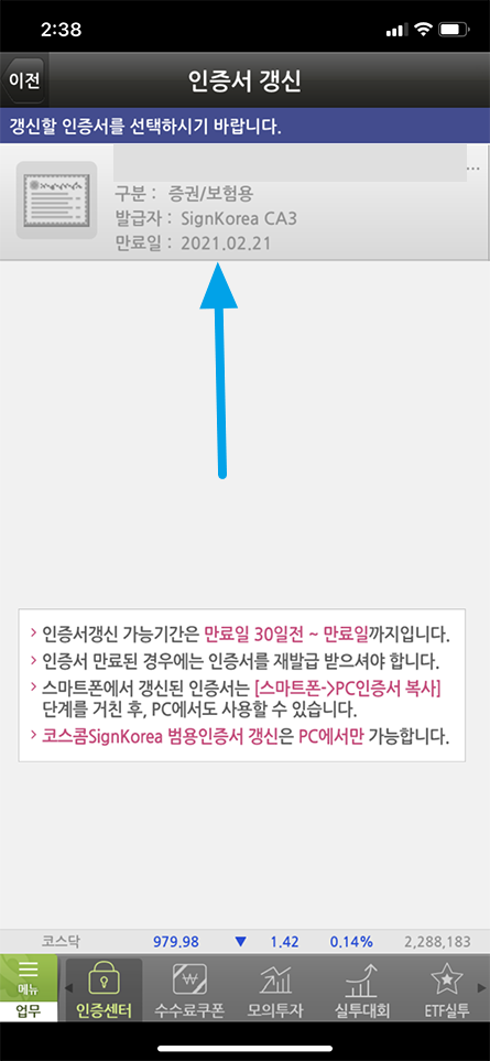 저는 PC와 모바일 모든 환경에서 주식 거래를 하므로 PC 사이트를 이용해 인증서 갱신을 하였고 갱신 이후 모바일로 다시 인증서를 복사하는 과정을 거쳤습니다.