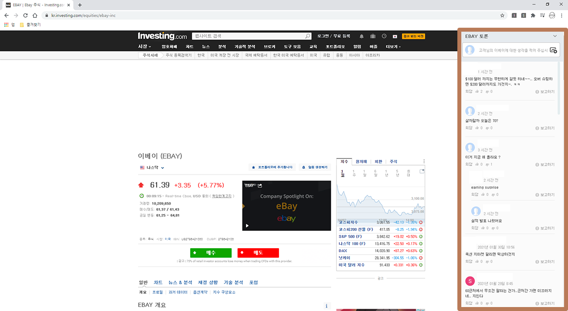 반대로 이베이 주가는 큰 상승을 했는데 사람들의 반응은 어떤지 궁금해 들어가 보고는 합니다. 주가의 폭등과 폭락 상황에서 사람들의 반응이 궁금해 자주 이용하고 있는 사이트입니다. 주식의 폭등과 폭락 주식의 토론장을 오가다 보면 사람들의 환희와 절망이 공존하고 있습니다.