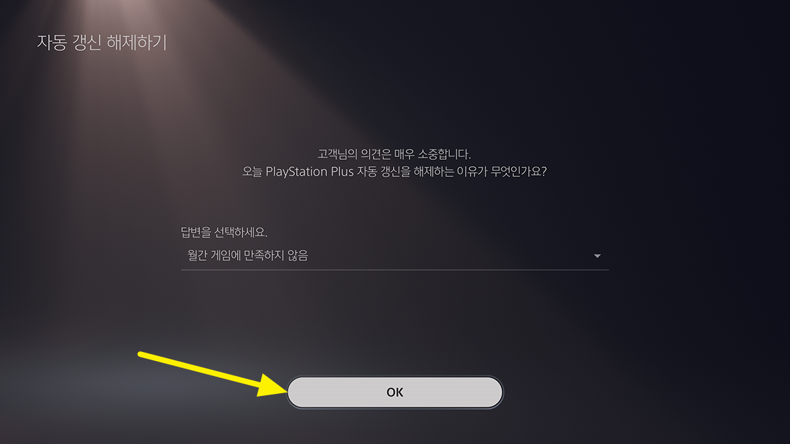 답변을 선택하시면 되며 OK 버튼을 선택하시면 PS5 정기 서비스는 해제됩니다.