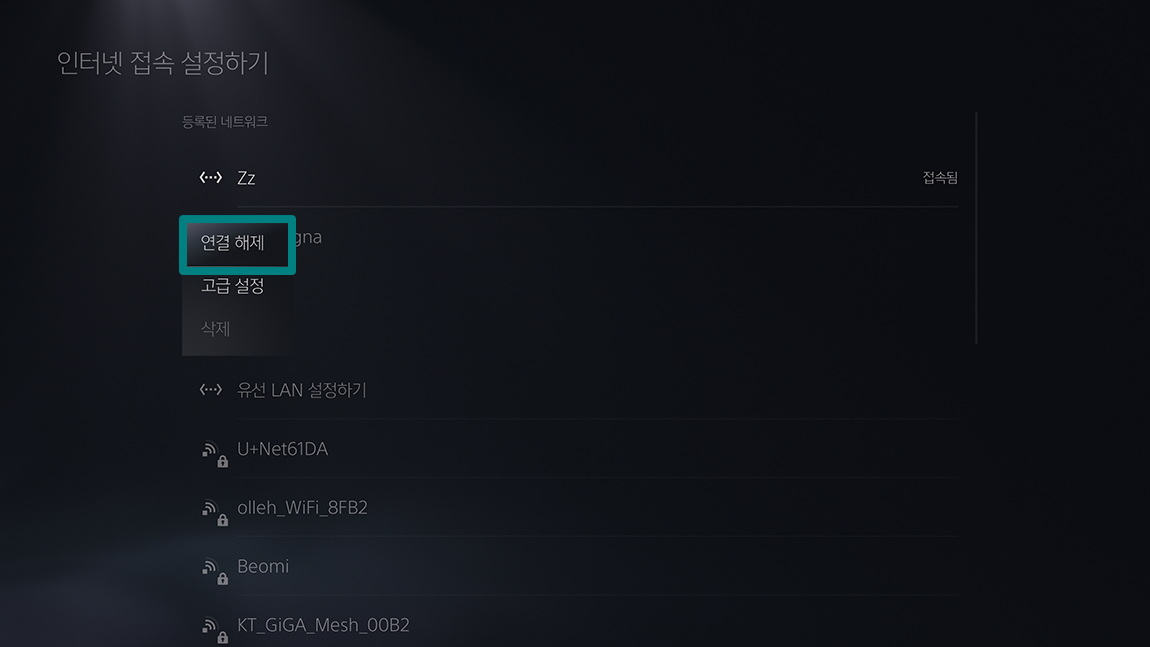 그리고 연결 해제를 눌러 네트워크 속도가 더 빠른 유선 네트워크 방식으로만 연결되도록 설정하시면 좋을 듯합니다. 유선과 무선 방식을 모두 연결해 놓으셨다면 와이파이 속도가 더 빠른 네트워크를 이용하지 않을 가능성이 있으니 현재 연결된 PS5 기기의 인터넷 접속 상태가 어떻게 선택되어 있는지 체크해 보시면 좋을 것 같습니다.